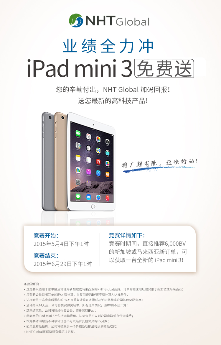 - 上述优惠只适用于NHT Global新/马消费会员,而必须是持续合格的消费会员。